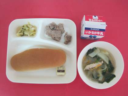 鶏肉、じゃがいも、たまねぎ、にんじん、ほうれんそうを使ったスープとキャベツをいため、砂糖、塩、ワインビネガー、薄口しょうゆで味つけしたサワーソテーです。