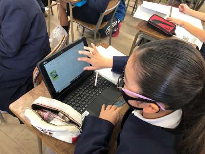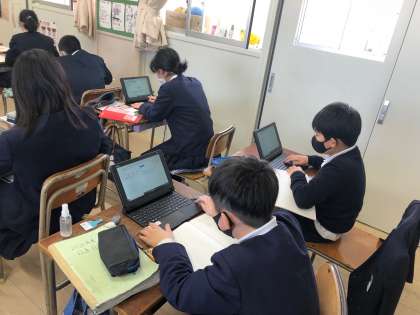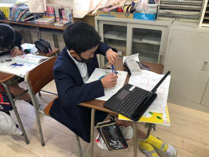 タブレット端末を使って調べ学習をしています。食品ロスの原因やそのためにできることを調べています。調べたことを意見文にまとめる予定です。
