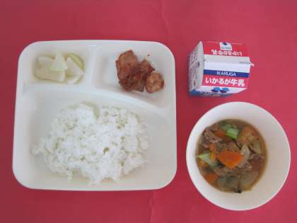 豚肉、あつあげ、はくさい、たまねぎ、チンゲンサイ、にんじん、しいたけを使った中華煮とだいこんの中華あえです。