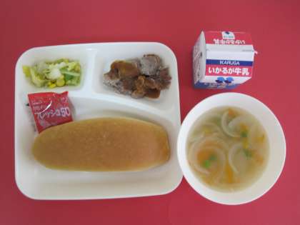 鶏肉、じゃがいも、たまねぎ、にんじん、グリンピースを使ったスープとキャベツとコーンを炒め、塩、こしょうで味つけしました。