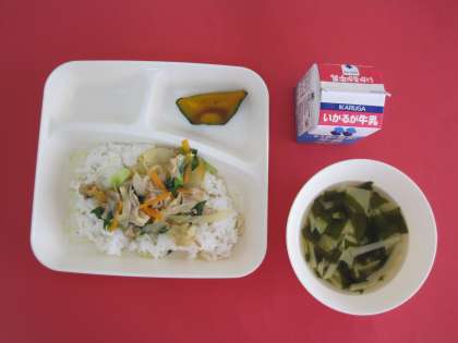 ゆば、たけのこ、わかめを使ったすまし汁とかぼちゃのしょうゆ焼きです。