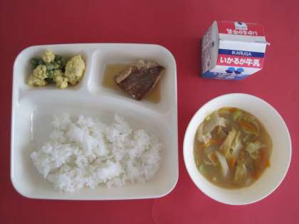 うすあげ、キャベツ、たまねぎ、にんじん、白ねぎを使ったみそ汁と旬のえんどうと鶏ひき肉を卵でとじたえんどうの卵とじです。卵にアレルギーのある児童は、卵でとじる前に取り分けたものを食べました。