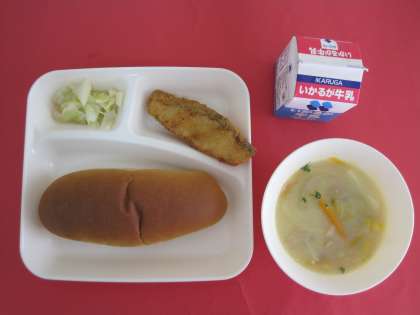 ベーコン、じゃがいも、たまねぎ、コーン、にんじん、パセリ、豆乳を使ったスープとキャベツのいためものです。