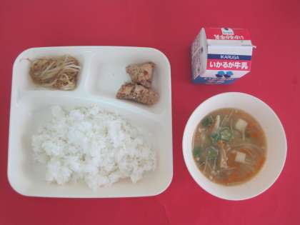 とうふ、たまねぎ、キャベツ、にんじん、オクラ、えのきたけを使ったみそ汁ともやしのおひたしです。