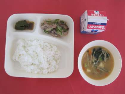 さつまいも、とうふ、こまつな、にんじん、もやし、えのきたけを使ったみそ汁と季節のオクラを使ったいためものです。