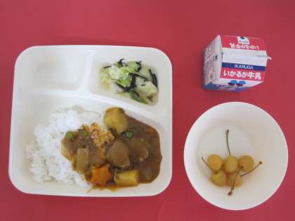 ひじきを使ったドレッシングでキャベツを和えたものと缶詰めのさくらんぼです。給食のさくらんぼは赤く着色していません。