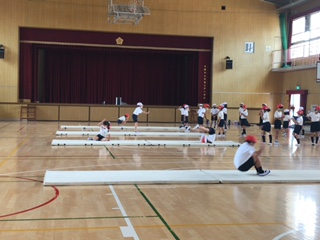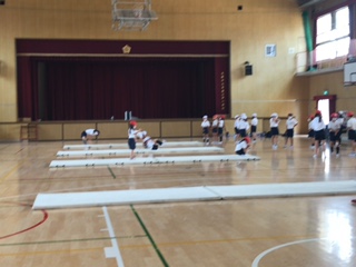 3年生の体育は、体育館ではマット運動をしています。