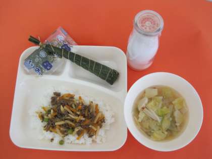 牛肉を使ったちらしずしと五目汁、そしてちまきです。