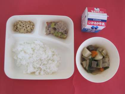 さといも、こんにゃく、たまねぎ、れんこん、にんじん、さんどまめ、しめじを使ったふきよせ煮とツナとひきわり大豆を使ったツナ大豆そぼろです。