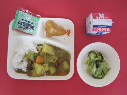 いつもの牛肉を使ったカレーライスにえびフライが付きました。当番の児童が、見本の給食を見て「えびフライや!」と何人も飛び上がって喜んでいました。