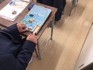 3年生の図工は、くぎうちトントンで作った作品が完成し、その作品を班であそんでみるなどの交流をしました。