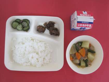 豚肉、じゃがいも、つなこんにゃく、たまねぎ、にんじん、さんどまめを使った和風の煮ものときゅうりを赤じそを使ったたれで和えたあえ物です。