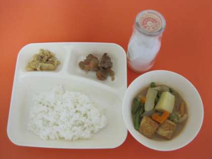 じゃがいも、あつあげの他に野菜を使ったみそ味の煮ものです。