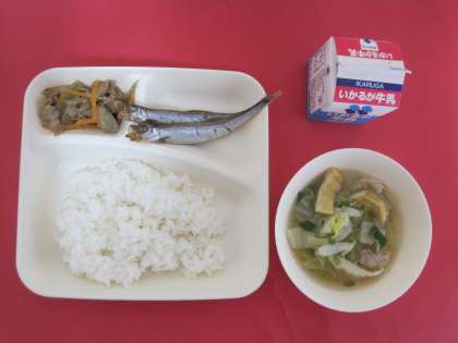 鶏肉、うすあげ、はくさい、たまねぎ、青ねぎを使った五目汁と豚肉、ごぼう、にんじんを使ったきんぴらごぼうです。