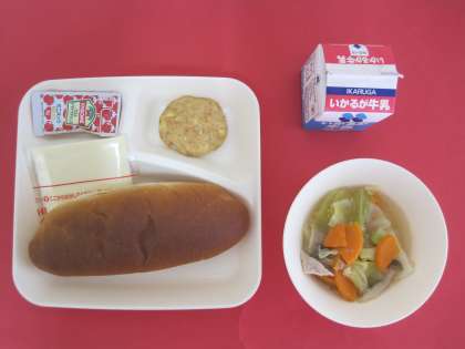 季節のカリフラワーのほかに、豚肉、キャベツ、にんじん、むき枝豆を使ったスープ煮とスライスチーズです。