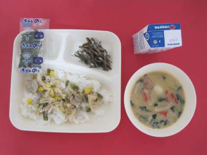 豚肉、れんこん、さんどまめ、コーン、かんぴょうを使ったれんこんのちらしずしで、食べるときにきざみのりをかけて食べます。