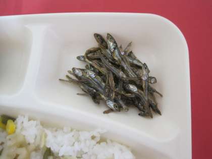 しらたまもちを使ったぞう煮で、他に鶏肉、さといも、だいこん、金時にんじん、みつばを使っています。かつおぶしでだしをとり、白みそを多く使った合わせみそで味つけしています。それとごまめです。ごまめは、焼きもの機で焼き、砂糖、みりん、濃口しょうゆを合わせたたれをからめました。