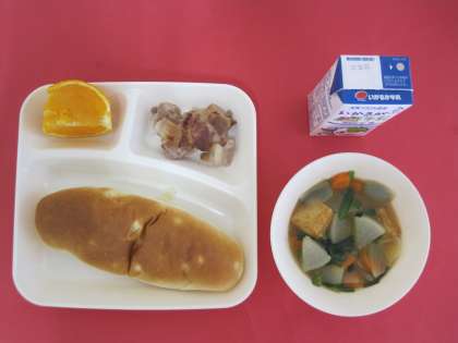 あつあげ、はくさい、だいこん、たまねぎ、にんじん、にらを使った中華煮とデコポンです。