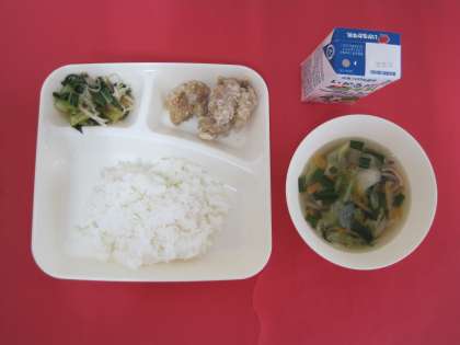 豚肉、キャベツ、たまねぎ、にんじん、にら、しいたけを使った中華スープとチンゲンサイともやしの和え物です。