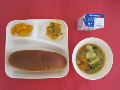 豚肉、じゃがいも、たまねぎ、キャベツ、にんじん、えだまめ、しめじを使ったカレー味のスープ煮です。