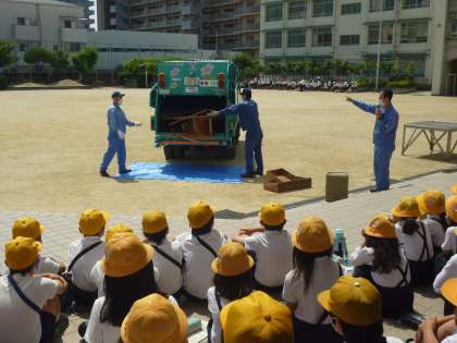 ごみの分別、減量について教えていただきました。粗大ごみのタンスをパッカー車が回収する様子も見学しました。大きな音を立て、粉砕され回収されていく様子に子どもたちは驚き、興味深く見学していました。