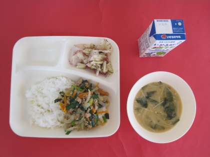 じゃがいも、えのきたけ、わかめを使ったみそ汁とキャベツの赤じそあえです。