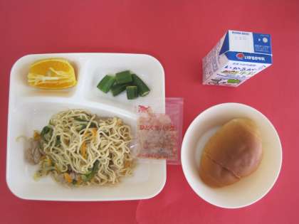 豚肉、いか、キャベツ、たまねぎ、にんじん、ピーマンを炒め、中華めんを加えてさらに炒め、塩、こしょう、濃口しょうゆ、薄口しょうゆで味つけした和風焼きそばです。食べるときにかつおぶしをかけて食べました。