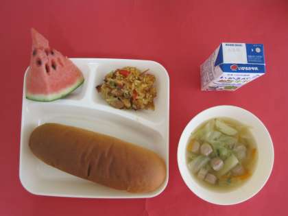 ウインナーソーセージ、じゃがいも、キャベツ、にんじん、パセリを使ったスープと季節のすいかです。
