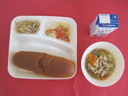 ベーコン、じゃがいもに塩、こしょうで下味をつけ、トマト、チーズを重ねてミニバットに入れて焼いたじゃがいもとトマトのチーズ焼きともやしとコーンのソテーです。