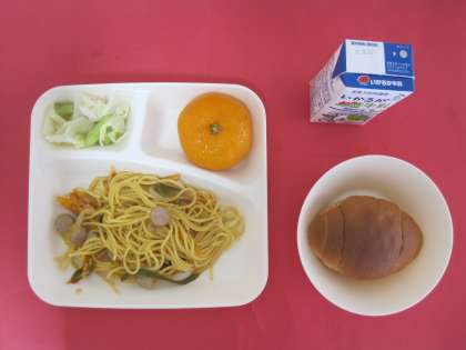 鶏肉、ウインナーソーセージ、たまねぎ、トマト(缶)、にんじん、ピーマン、を使ったトマト味のスパゲッティです。