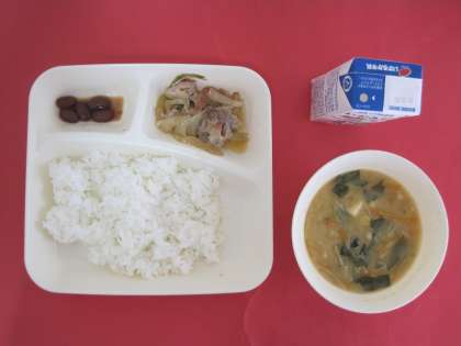 とうふ、キャベツ、にんじん、もやし、えのきたけ、わかめを使ったみそ汁と金時豆を熱湯につけた後、釜で柔らかくなるまで煮た金時豆の煮ものです。