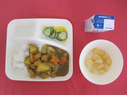 鶏肉、じゃがいも、たまねぎ、にんじん、グリンピースを使ったチキンカレーライスです。米粉のカレールウの素を使っています。