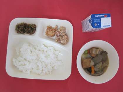 あつあげ、はくさい、ごぼう、にんじん、むきえだまめ、しいたけを使った煮ものとかつおぶし、だいこん葉、いりごまを炒め、みりん、濃口しょうゆで味つけしたおかかなっ葉です。