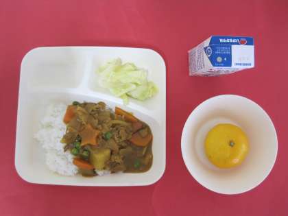 豚肉、じゃがいも、たまねぎ、にんじん、グリンピースを使ったポークカレーライスです。今日は、米粉のカレールウの素を使っています。