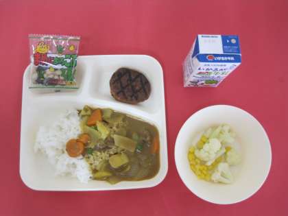 牛肉、じゃがいも、たまねぎ、にんじん、グリンピースを使ったカレーにミニハンバーグを添えています。