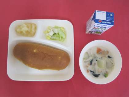 鶏肉、じゃがいも、たまねぎ、にんじん、ほうれんそう、エリンギを使ったクリームシチューです。ホワイトルウを作ってとろみをつけました。