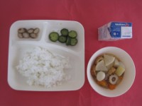 鶏肉、さといも、つなこんにゃく、たまねぎ、はくさい、にんじん、さんどまめ、しめじを使った和風の煮ものと高野どうふとむきえだまめを使った煮ものです。