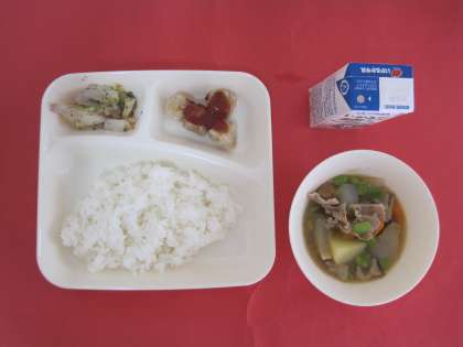 豚肉、じゃがいも、つなこんにゃく、たまねぎ、にんじん、むきえだまめ、しいたけを使った和風の煮ものとキャベツの和え物です。