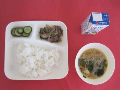 焼き豚、とうふ、にんじん、もやし、えのきたけ、わかめを使ったスープときゅうりの甘酢づけです。