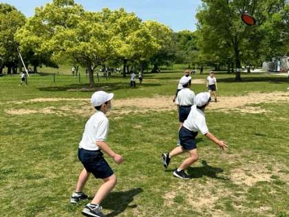 大芝生広場では、大縄跳びや、フリスビー、おにごっこなどの遊びで、楽しく遊びました!