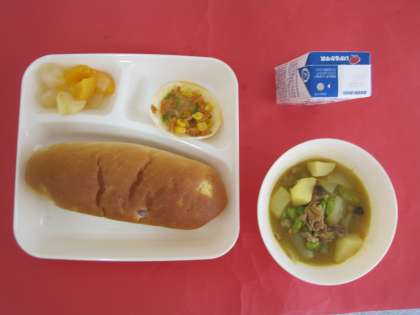 豚肉、じゃがいも、たまねぎ、キャベツ、にんじん、むきえだまめ、しめじを使ったカレー味のスープ煮です。