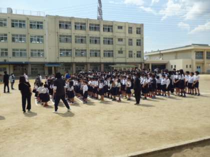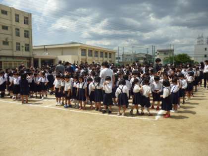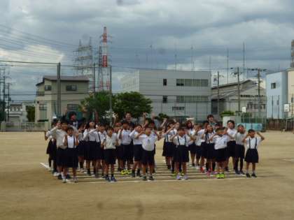 23日の航空写真に続いて、全校児童で、さらに各学年で集合写真を撮りました。