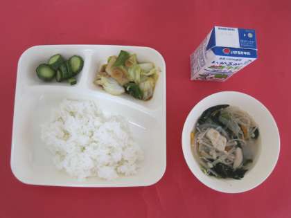 鶏肉、たまねぎ、こまつな、にんじん、えのきたけを使った中華風のスープときゅうりのピリ辛あえです。