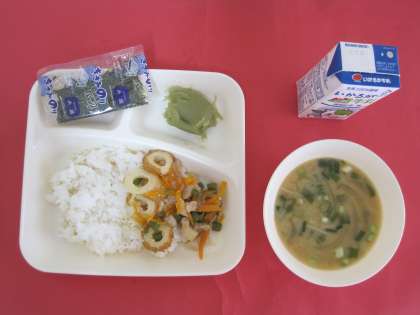 じゃがいも、キャベツ、たまねぎ、青ねぎ、えのきたけを使ったみそ汁と上新粉、まっ茶、しろいんげんのペースト、砂糖、水を混ぜ合わせて焼き物機で蒸したまっ茶ういろうです。