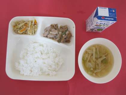 鶏肉、キャベツ、たけのこ、えのきたけを使ったすまし汁と切干しだいこん、うすあげ、にんじんを使った煮ものです。