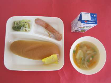 鶏肉、じゃがいも、たまねぎ、にんじん、グリンピースを使ったスープとキャベツとさんどまめを使ったサラダです。
