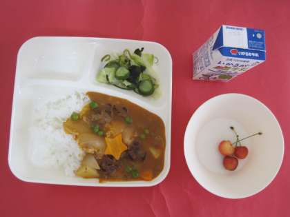 キャベツ、きゅうり、ミックス海そうを使ったサラダと季節のさくらんぼです。