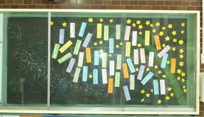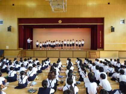校長先生から平野区子ども会親善ソフトボール大会の表彰がありました。その後、七夕について説明がありました。玄関掲示にも、3年生が短冊に一人ひとりの夢を書いています。夢に向かって進んでいく子ども達を応援していければと思っています。