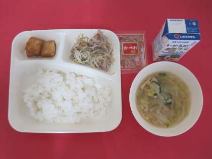 鶏肉、キャベツ、たまねぎ、たけのこ、青ねぎ、えのきたけを使った五目汁とあつあげのしょうがじょうゆかけです。
