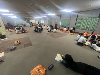 予定より早く山登りが終わったので、飯ごう炊さんまでの間、冷房の効いた多目的ホールで振り返りをしたり、自由時間を過ごしています。